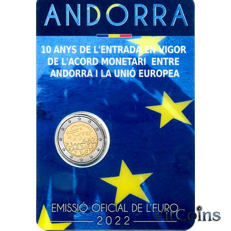 Монета Андорра 2 евро 2022 год. 10 лет вступлению в силу валютного соглашения между Андоррой и Евросоюзом