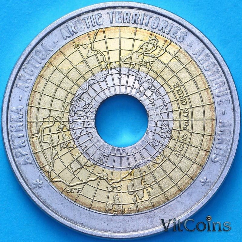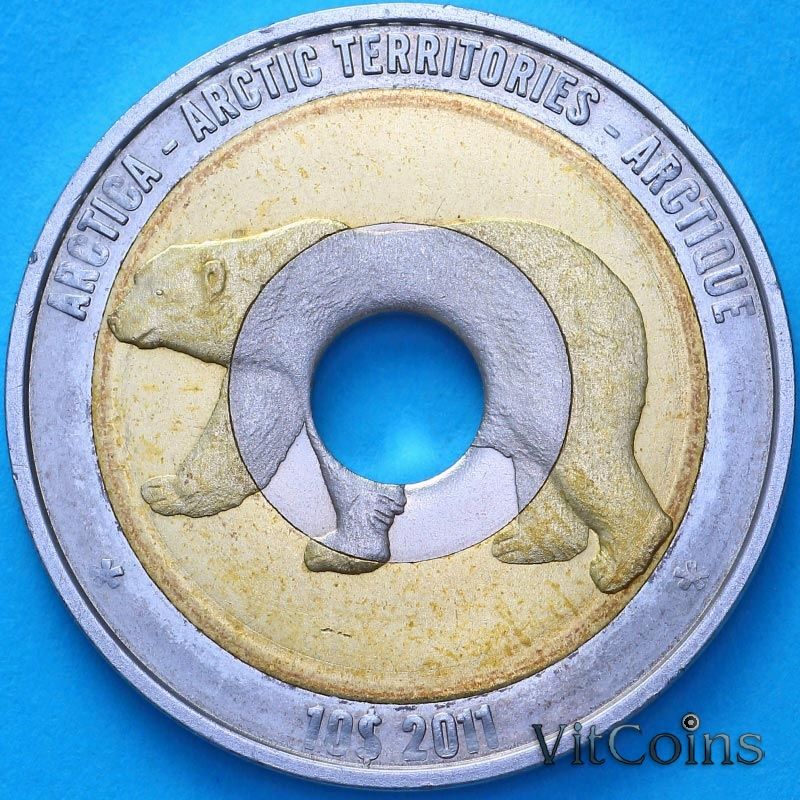 Триметаллическая 10-долларовая монета 2011 года "Арктические территории" была отчеканена в двух вариантах. Обе имеют