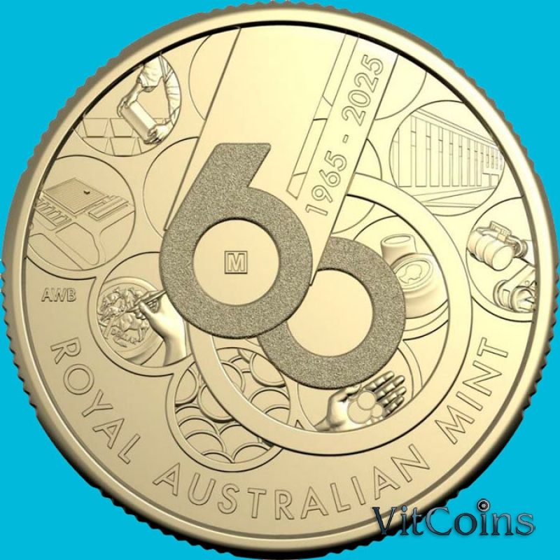 Монета Австралия 1 доллар 2025 год. 60 лет монетному двору. Монетный двор Мельбурн