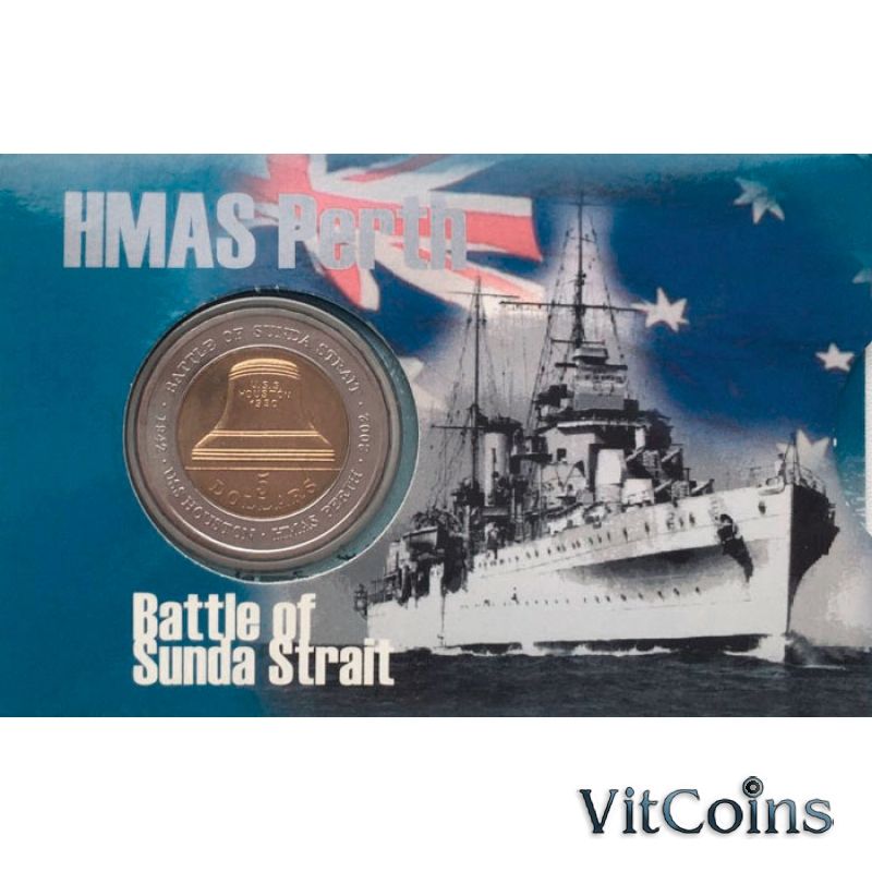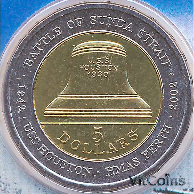 Австралия 5 долларов 2002 год. Юбилейная монета в блистере. 60 лет бою в Зондском проливе, в котором затонули американский крейсер «Хьюстон» и австралийский «Перт».