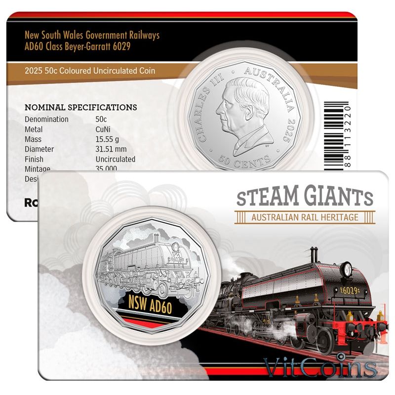 Монета Австралия 50 центов 2025 год. Железные дороги Нового Южного Уэльса, Бейер Гарратт 6029. Блистер