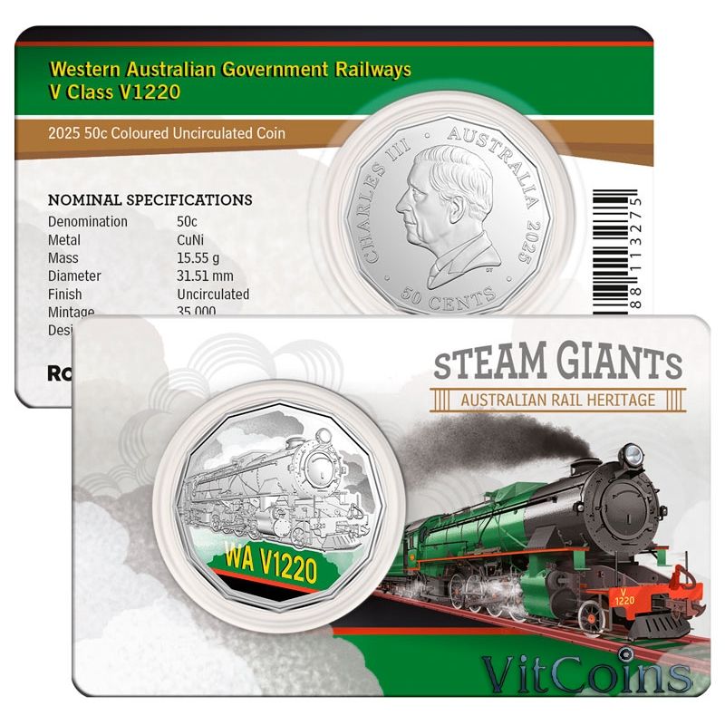 Монета Австралия 50 центов 2025 год. Железные дороги Западной Австралии, Класс V1220. Блистер