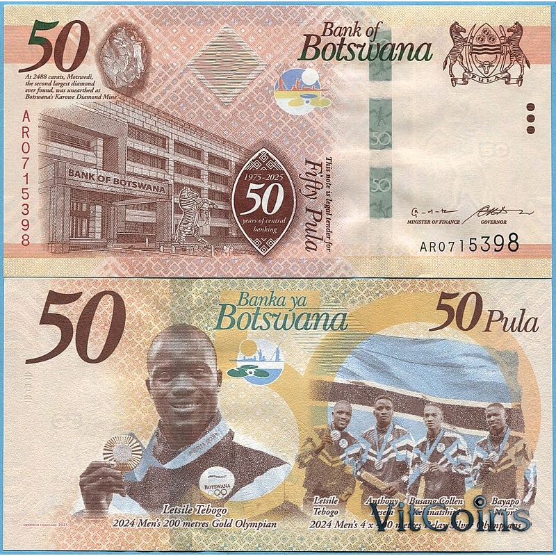Банкнота Ботсвана 50 пула 2025 год. 50-летие Банка Ботсваны.
