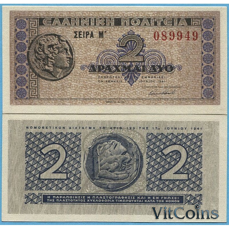 Банкнота Греция 2 драхмы 1941 год.