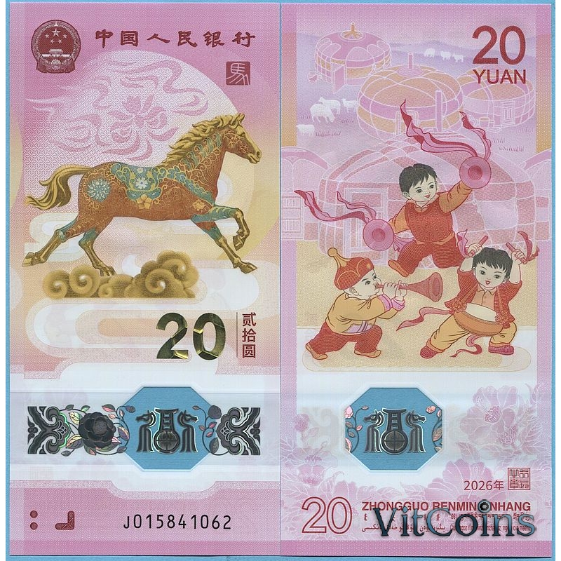 Юбилейная банкнота Китай 20 юаней 2026 год. Год лошади