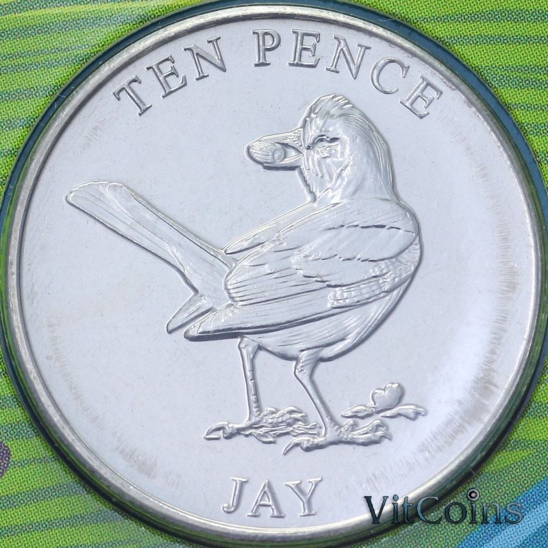 Монета Гернси 10 пенсов 2021 год. Сойка. Блистер