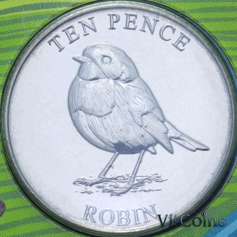Монета Гернси 10 пенсов 2021 год. Зарянка. Блистер