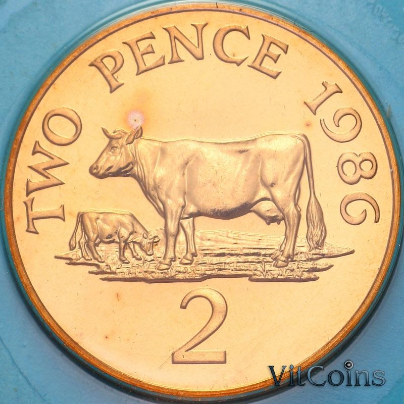 Монета Гернси 2 пенса 1986 год. Корова.