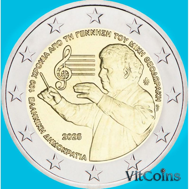 Юбилейная монета Греция 2 евро 2025 год. 100 лет со дня рождения Микиса Теодоракиса