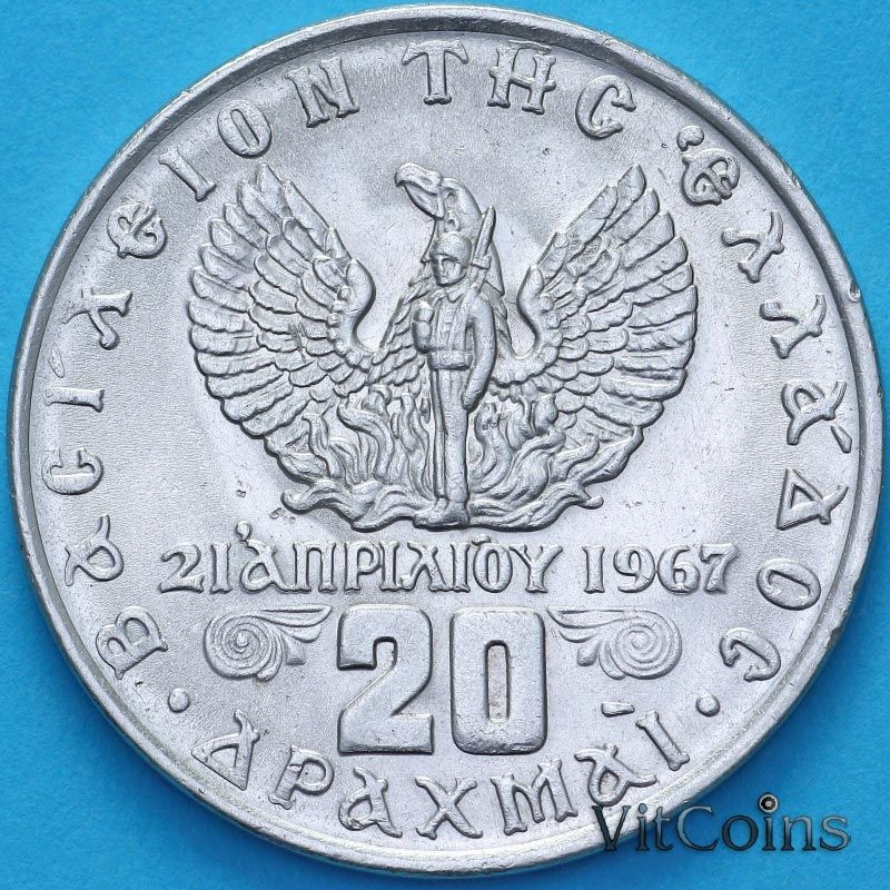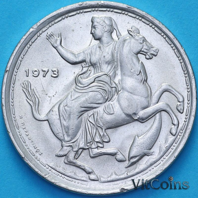 Греция 20 драхм 1973 год. Самая редкая разновидность: широкий кант и прерывающаяся волна (в районе копыта лошади).