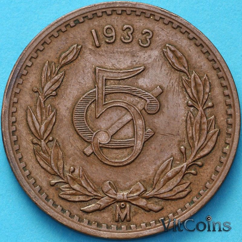 Монета Мексика 5 сентаво 1933 год.