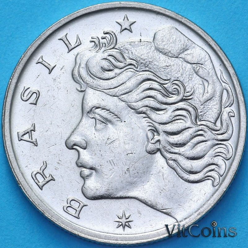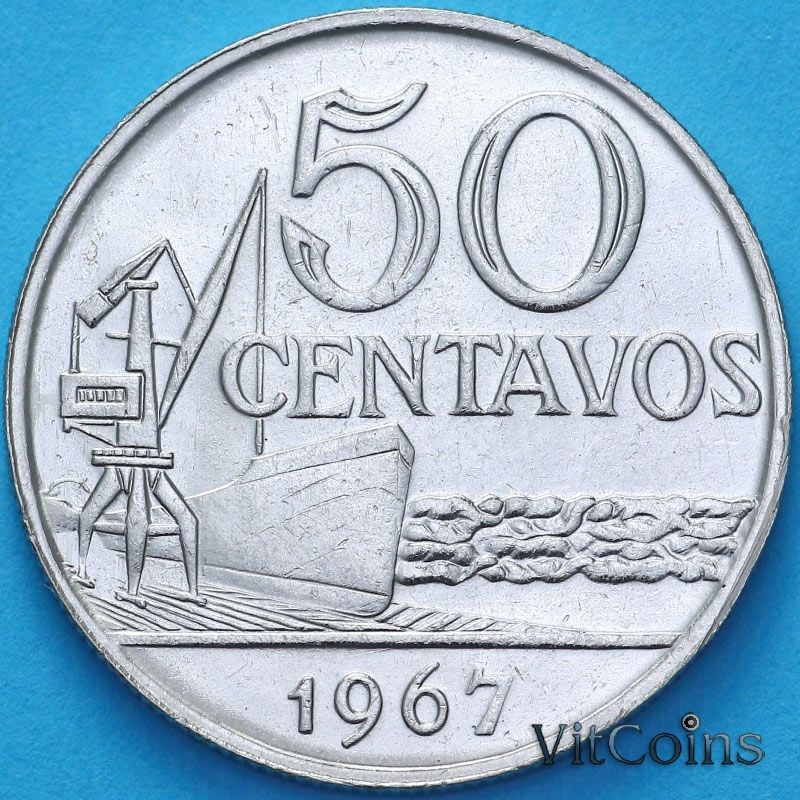 Монета Бразилия 50 сентаво 1967 год. Фигура Республики. Морской порт.