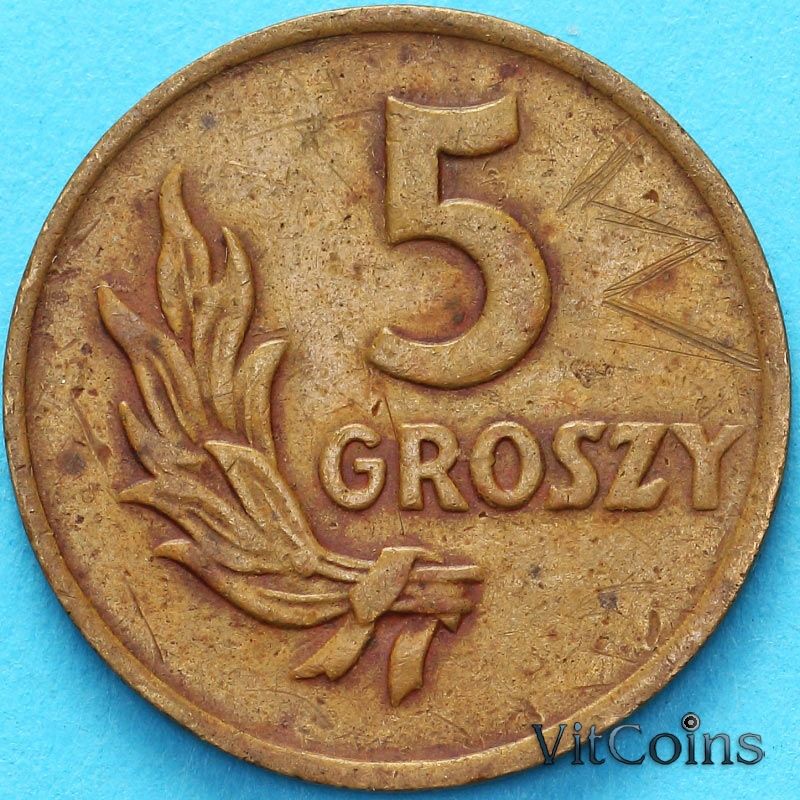 Монета Польша 5 грошей 1949 год.