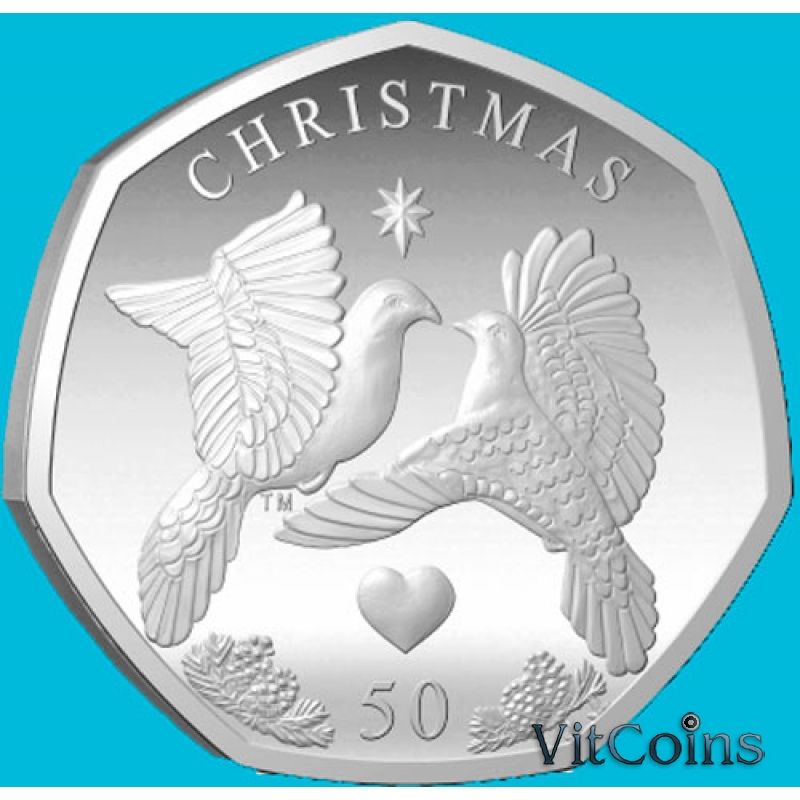 Монета Остров Мэн 50 пенсов 2025 год. Рождество. Две горлицы. BU