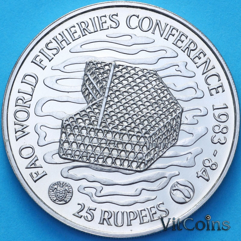 Юбилейная серебряная монета 25 рупий 1983 год. ФАО - Всемирная конференция по рыбному хозяйству