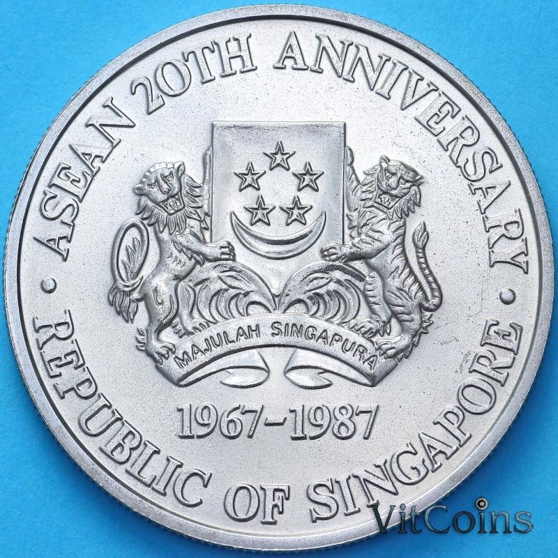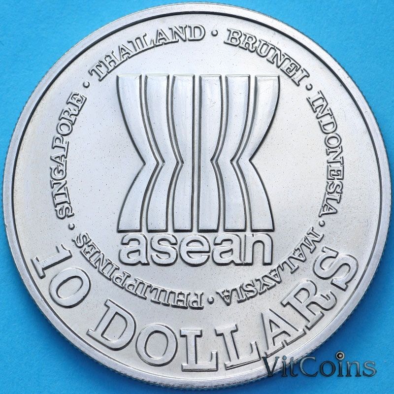 Юбилейная монета. Сингапур 10 долларов 1987 год. АСЕАН. 20 лет со дня основания