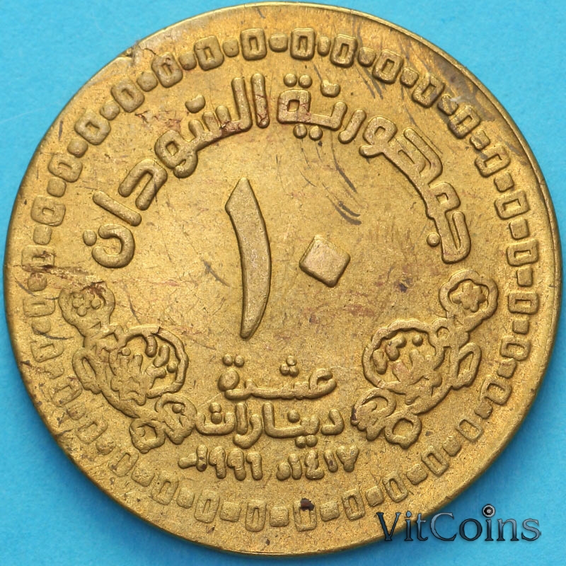 Монета Судан 10 динар 1996 год.  Здание Центрального банка Судана