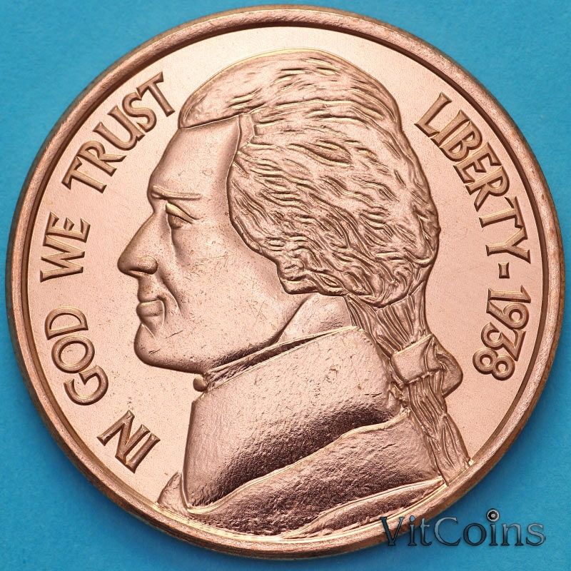 Монетовидный жетон унция меди 999 США. 2025 года. 5 центов 1938. Джефферсон Никель