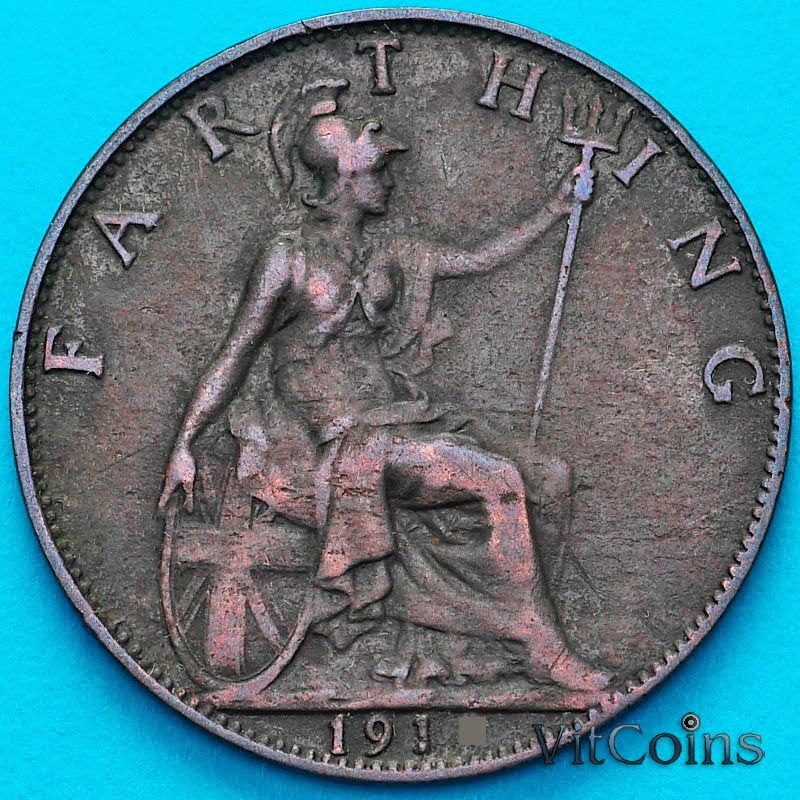 Монета Великобритания 1 фартинг 1913 год.