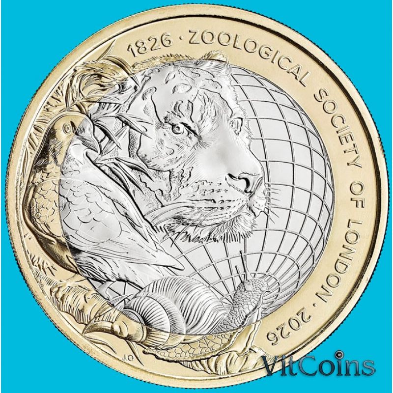 Монета Великобритания 2 фунта 2026 год. 200 лет Лондонскому зоологическому обществу