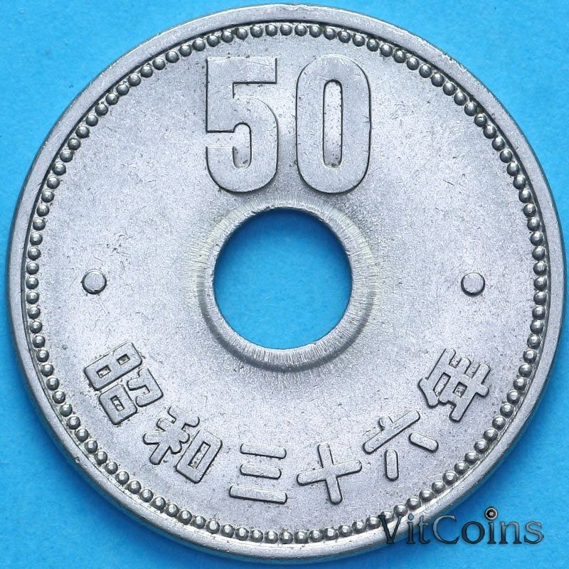 Монета Япония 50 йен 1961 год. 36 год эпохи Сёва. Хризантема.